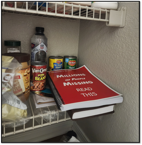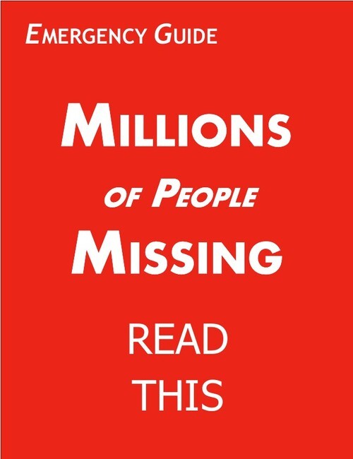 3 – Store the Emergency Guide in a way that the words “Millions of People Missing” will be clearly visible. Recommended locations: the coffee table, the kitchen bar, near where food or weapons are stored, or in your car.